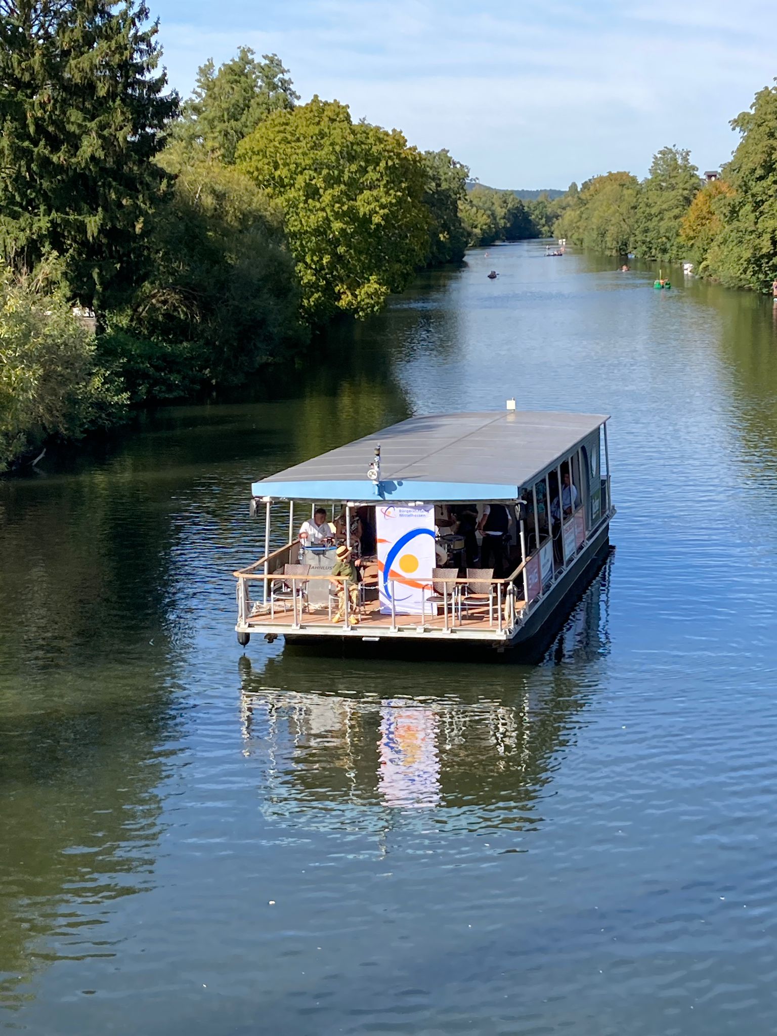 Beschwingte Musik, herrliches Spätsommerwetter und eine Bootstour auf der Lahn: So lautete das Rezept für die jüngste Auflage von „Musik ab, Leinen los“. Zum vierten Mal fand die Veranstaltung statt, bei der Live-Musik an Bord der „Lahnlust“ gespielt wird, während die Gäste an Bord und auch an Land die frische Brise und die Unterhaltung genießen. Die Bürgerstiftung Mittelhessen hat das Format finanziell unterstützt, „um die kulturelle Vielfalt in Gießen zu fördern“, wie Oliver Manger, Vorsitzender der Stiftung, sagte. An Bord der „Lahnlust“ sorgte diesmal die New Orleans-Band „The Small Easy“ für gute Laune. Stefan Koch an der Klarinette, JJ Fischer am Banjo, Joe Bonica an der Stehtrommel und Andreas Jamin am Sousaphon eine gekonnte Mischung aus Jazz, Blues und modernen Klassikern. Und nicht selten wagten sogar Zuhörer an Land ein kleines Tänzchen zu den Klängen von der Lahn.
