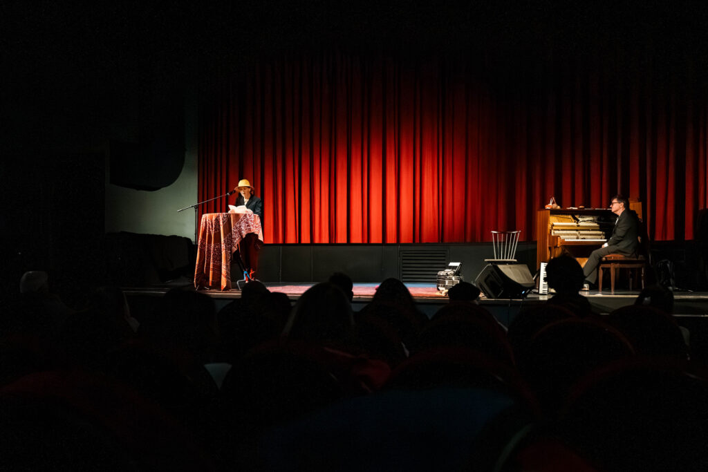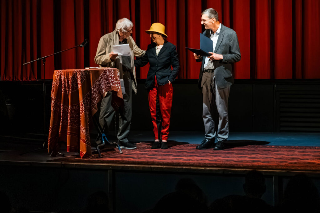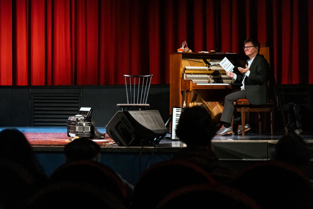 Der Stifter Günter Kämpf trug die Begründung der sechsköpfigen Jury vor. Gemeinsam mit Dr. Peter Ihring vom Förderverein Stadtbibliothek überreichte er der Autorin die Ehrenurkunde. Anschließend hielt Ruth Sonderegger, Philosophin und Professorin für Ästhetische Theorie an der Wiener Akademie der Künste, die Laudatio. Zum Abschluss las die Autorin aus dem prämierten Werk. Die einfallsreiche musikalische Begleitung mit Piano und Akkordeon lag in den Händen von Helmut Fischer.